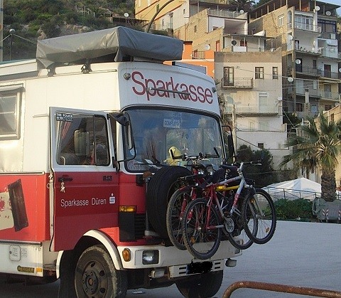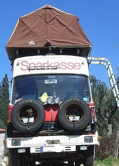 Der Griff im Schriftzug " Sparkasse" dient als Hilfe zum Hochklettern. Das Dachzelt klappt wie eine Zieharmonika zusammen und manchmal muß man nachhelfen, dass auch alles so sitzt, wie es soll. Dann klettert einer von uns über die Reserve - Reifen nach oben und kann sich an diesem Griff festhalten - wenn er mag - oder auch anders oder so ähnlich..... wir benutzen den Griff eigentlich nicht....