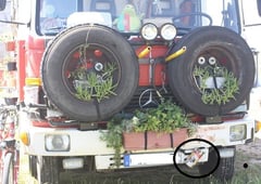 Zwischen den Reserve Reifen haben wir ein Auto - ja wie nennt man das ? - ein Typen Schild, ein Emblem....ein