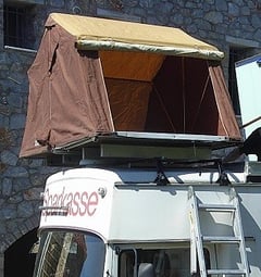 Und so sehen wir dann aus, wenn wir unser Zelt geöffnet haben. Alle, die selber so ein Dachzelt haben, geniessen dieses gute Stück!!!