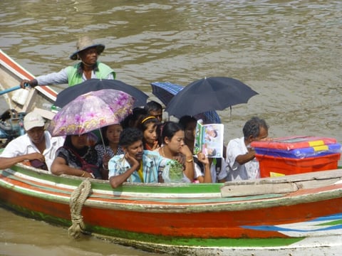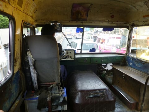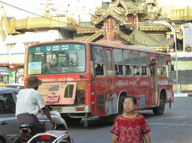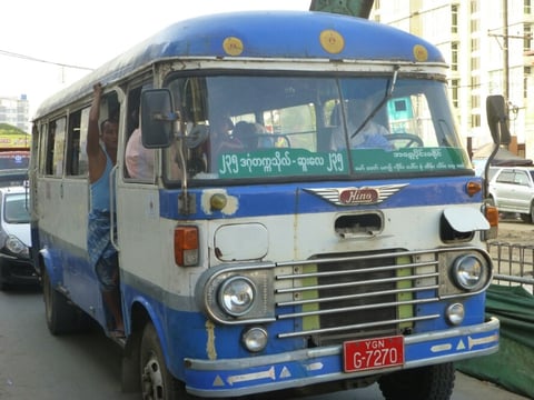 Das Ungetüm!!! Der Kleinbus, offensichtlich von einer Privatfirma, denn sie stopfen die total klapprigen Busse voll, dass einem schwindelig wird!!! Wir sind damit super günstig für 100 bis 200 ks (Kyats) ( 1Euro = 1335 Kyats) überall hin gekommen und hatten viel Spass mit den Fahrern und mit den Einheimischen!!! Und irgend jemand passt immer auf uns auf...dass wir nicht rausfallen, dass wir richtig aussteigen...dass wir gut sitzen...womit ich allerdings schlecht zurecht komme ist, daß das Ein- und Aussteigen der totale Stress ist. Der Fahrer fährt bereits weiter, während ich noch die hammer hohen Stufen versuche ein- bzw. auszusteigen. Die Fahrt mit einem Taxi z.Bsp zur Sule Pagode auf der Verkehrsinsel hätte 4000 ks gekostet.