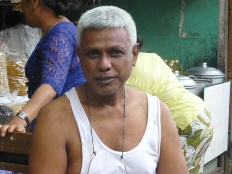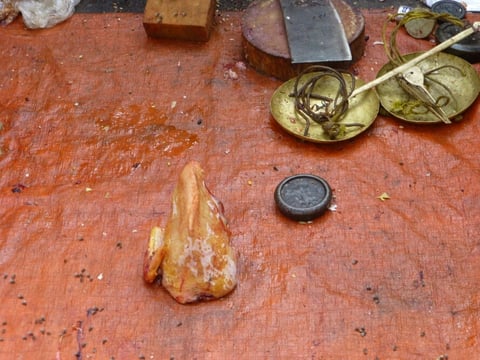 ...gleich muss er ausspucken....das sieht dann aus, als blute er aus dem Mund.... vor ihm auf dem Tisch liegen die Blätter, in die die Betelnuss und der gelöschte Kalk eingewickelt sind. Ich merk gerade, ich werde einen einzelnen Bericht über diese Volks - Droge verfassen!!!