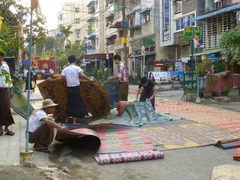 Bereits am Nachmittag fällt uns auf, daß Männer unzählige kleine Teppiche in einer Strasse ausbreiten und daß am Ende eine Bühne steht.