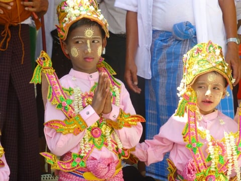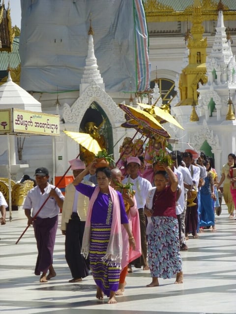 Wir sitzen und genießen diese verschiedenen Pagoden, da kommt eine Zeremoniengruppen daher. Die Familien tragen ihre Töchter und feiern sie, weil sie Novizinnen werden. Sie werden für 7 Tage im Kloster leben, bzw. morgens gebracht und abends geholt. Die Eltern bringen dann auch Essen für die Novizinnen und auch andere Gaben. Später, wenn die Mädchen älter sind, können sie nochmal in ein Kloster gehen, damit sie beten lernen und Gutes tun und ganz vielleicht in ihrem nächsten Leben als Mann wiedergeboren werden, um dann der ewigen Wiedergeburt endlich ein Ende machen zu können, was nur ein Mann kann, wenn er genug Gutes getan hat. ...Frauen ist es nicht möglich, in's Nirvana, dem Reich der Erlösung, zu kommen. Frauen beten auch in den hinteren Reihen, Männer vorne. Sie sind leider auch in dieser Gesellschaft deutlich weniger wert als Männer. Das ist vom Menschen so gemacht. Damit hat Buddha nix zu tun!!!