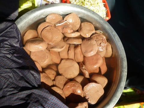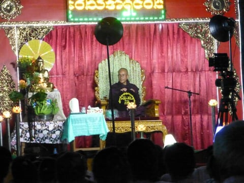 Am Abend gehen wir schauen und kommen grad zeitig zur Gebetsstunde. Die Einheimischen amüsieren sich sehr wohlwollend, als wir uns zu ihnen mit auf einen Teppich setzen. Da kommt durch die Mitte eine kleine Truppe junger Männer, die auf Muscheln das 'Horn' blasen und auf kleinen Gongs scheppern. Das hört sich echt so an, wie sie es im Fernsehen immer zeigen!!! Am Ende schreitet ein Obermönch den Mittelgang hinterher und rauf zur Bühne und betet von seinem heiligen Stuhl aus über eine Stunde die rituellen Gebetssätze in sein heiliges Mikrophon.